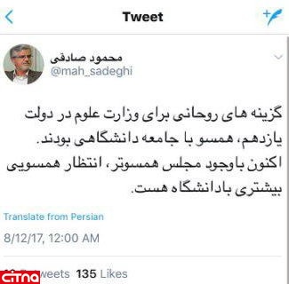 محمود صادقی در واکنش به این پویش دانشجویی؛ در تویتر خود نوشت: گزینههای روحانی برای وزارت علوم در دولت یازدهم، همسو با جامعه دانشگاهی بود. اکنون با وجود مجلس همسوتر، انتظار همسویی بیشتری با دانشگاه است.