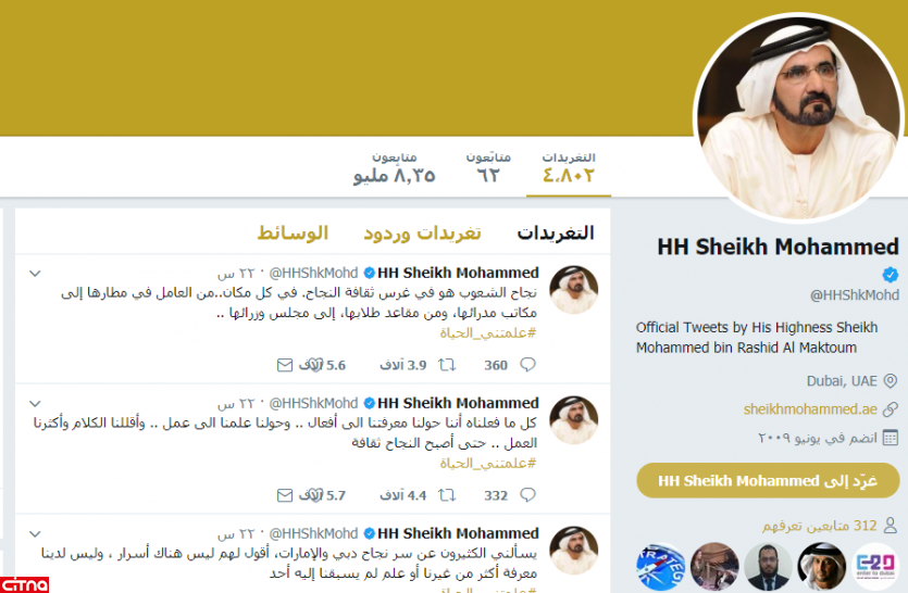 شیخ محمد بن راشد آل مکتوم، نائب رئیس دولت امارات، رئیس هیات دولت این کشور و حاکم دبی روز جمعه 18 آگوست 2017 با انتشار سه توئیت با مضمون "ما کمتر سخن گفتیم و بیشتر کار کردیم"، "دانش را به اقدام" و "علم را به عمل" تبدیل کردیم، راز موفقیت امارات را تشریح کرد.