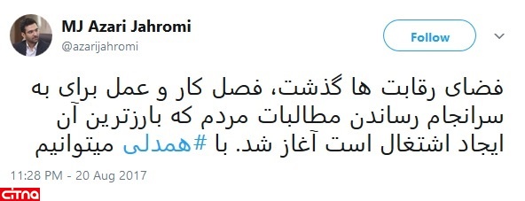به گزارش سیتنا، مهندس محمد جواد آذری جهرمی، وزیر ارتباطات دولت دوازدهم در صفحه اش در شبکه های اجتماعی نوشت: