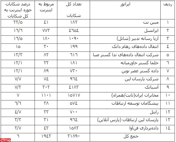 جدول شکایات مربوط به کم فروشی خدمات اینترنت در سال 95