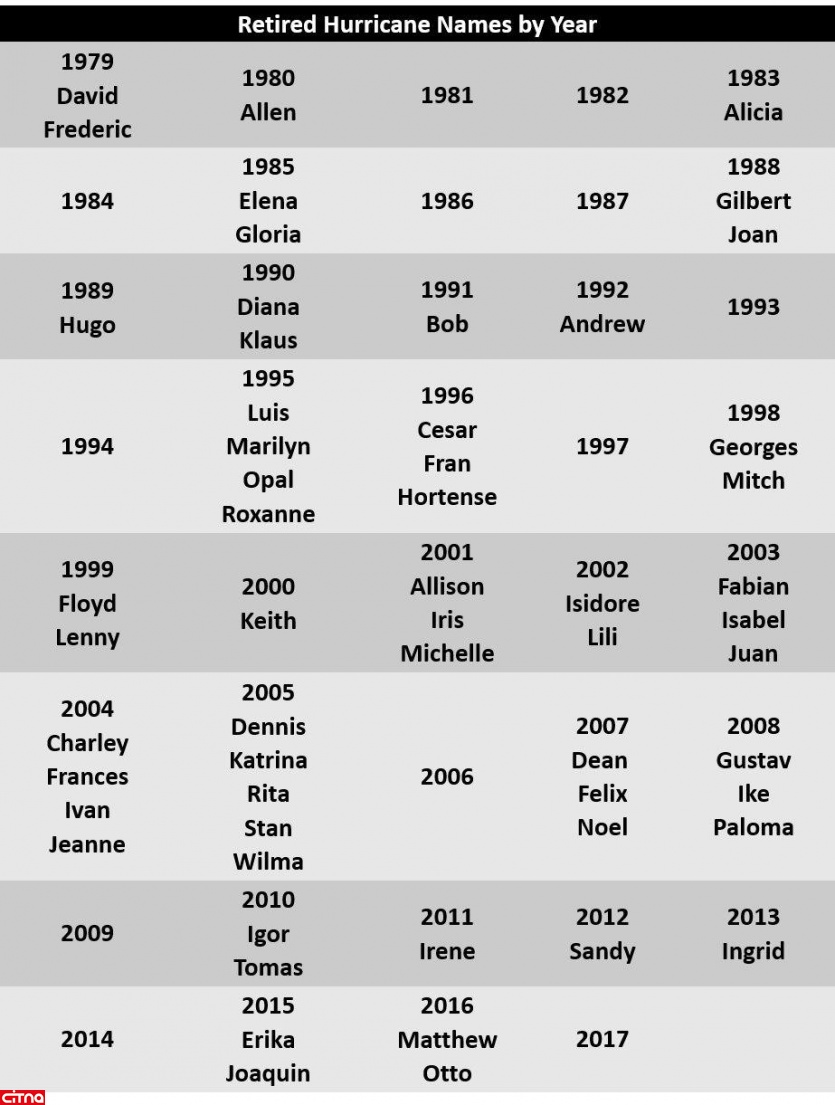 از جمله توفندهایی که اسمشان از لیست خارج شده و به اصطلاح بازنشسته شدهاند میتوان به توفند کاترینا، ایوان، سندی و به احتمال بسیار زیاد همین توفان هاروی اشاره کرد.