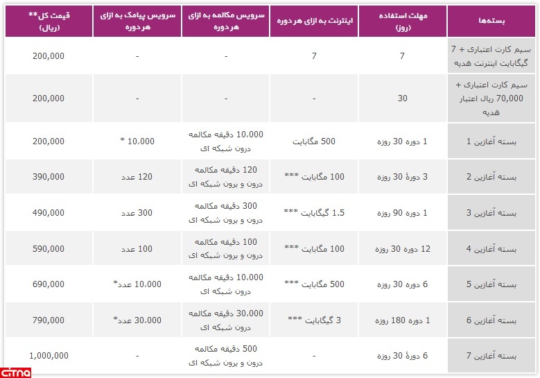 - هر یک از بستههای آغازین به همراه سیمکارت اعتباری ارایه میشود.