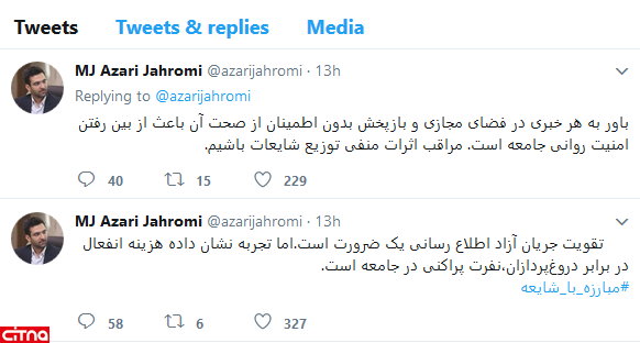 به گزارش سرویس وبگردی سیتنا، مهندس آذری جهرمی طی ساعات اخیر دو توئیت با محتوای ذیل را منتشر کرد: