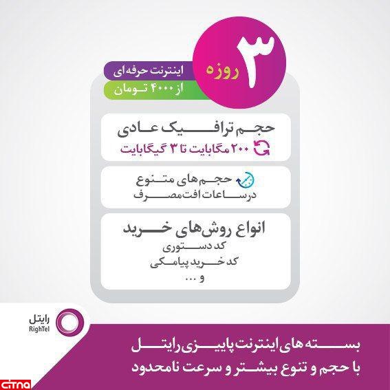 گفتنی است؛ بسته های اینترنت 3 روزه با حجم ترافیک عادی 200 مگابایت تا 3 گیگابایت از 4 هزار تومان ارائه می شود.