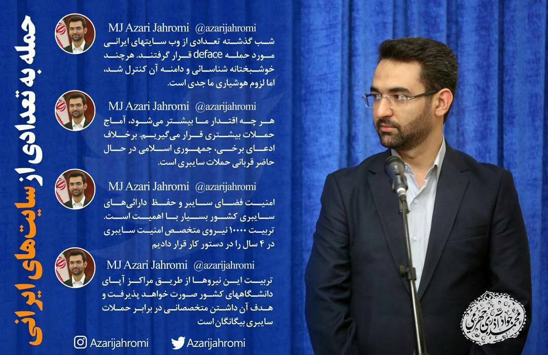 به گزارش سیتنا، مهندس آذری جهرمی با انتشار عکس نوشته ای در صفحه رسمی خود، در شبکه اجتماعی اینستاگرام ، نسبت به حمله به وب سایت های ایرانی، در شب گذشته واکنش نشان داد و نوشت: شب گذشته به تعدادی از وب سایتهای ایرانی حمله ای صورت پذیرفت. هر چند سریعا شناسائی و دامنه آن کنترل شد، اما لزوم هوشیاری ما جدی است.