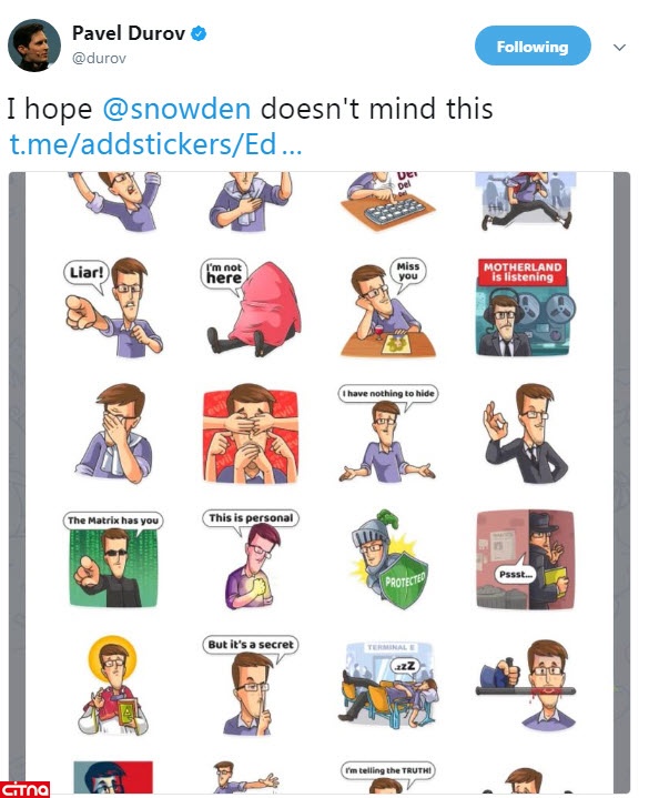 به گزارش سیتنا، مدیر تلگرام در توئیت خود نوشته است: «امیدوارم اسندون این را نفهمد!»