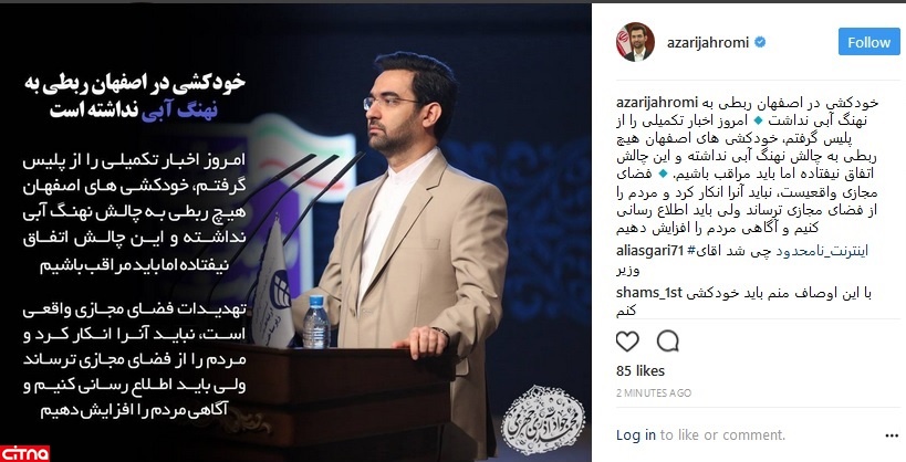 به گزارش سیتنا، مهندس محمد جواد آذری جهرمی در اینستاگرامش نوشت: