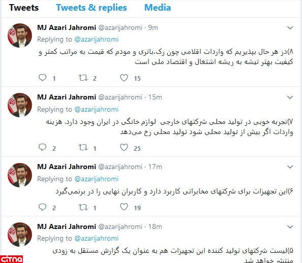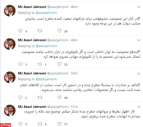در پی تشریح گام های اجرایی وزارت ارتباطات در حمایت از تولید داخل در توئیت های مجزای وزیر ارتباطات و طرح برخی سوالات از سوی کاربران شبکه های اجتماعی، آذری جهرمی در توئیت هایی که لحظاتی پیش منتشر شد، به سوالات پاسخ داد.