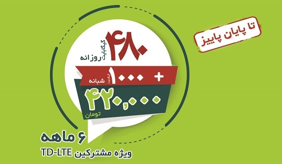 به گزارش سیتنا، در طرح تمدید TD-LTE، ششماه اینترنت را با 480 گیگابایت حجم روزانه و 1000 گیگابایت حجم شبانه تنها با 420 هزار تومان تهیه نمایید.