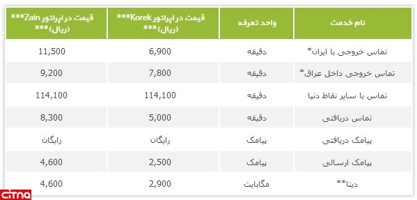 * هزینه تماس خروجی و دریافتی رومینگ بینالملل با اپرتور Korek بر اساس ثانیه محاسبه خواهد شد. (مثال: 10 ثانیه تماس خروجی با ایران معادل با 1,150 ریال محاسبه خواهد شد) و هزینه تماس رومینگ بین الملل با اپراتور Zain به صورت دقیقه ای محاسبه خواهد شد. (مثال 10 ثانیه تماس خروجی با ایران معادل با 11,500ریال محاسبه خواهد شد)