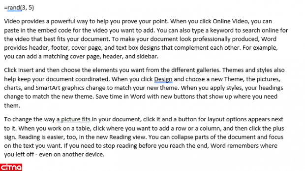 همانطور که میبینید، دو عدد در بالا دیده میشوند؛ اولین عدد (از چپ) تعداد پاراگرافهایی که ورد میسازد را مشخص میکند و دومی، تعداد خطهای هر پاراگراف است. مثلا در زیر، ما عبارت (5 ,3)rand= را تایپ کردهایم که نشاندهنده 3 پاراگراف است و هر کدام از آنها، 5 خط دارند: