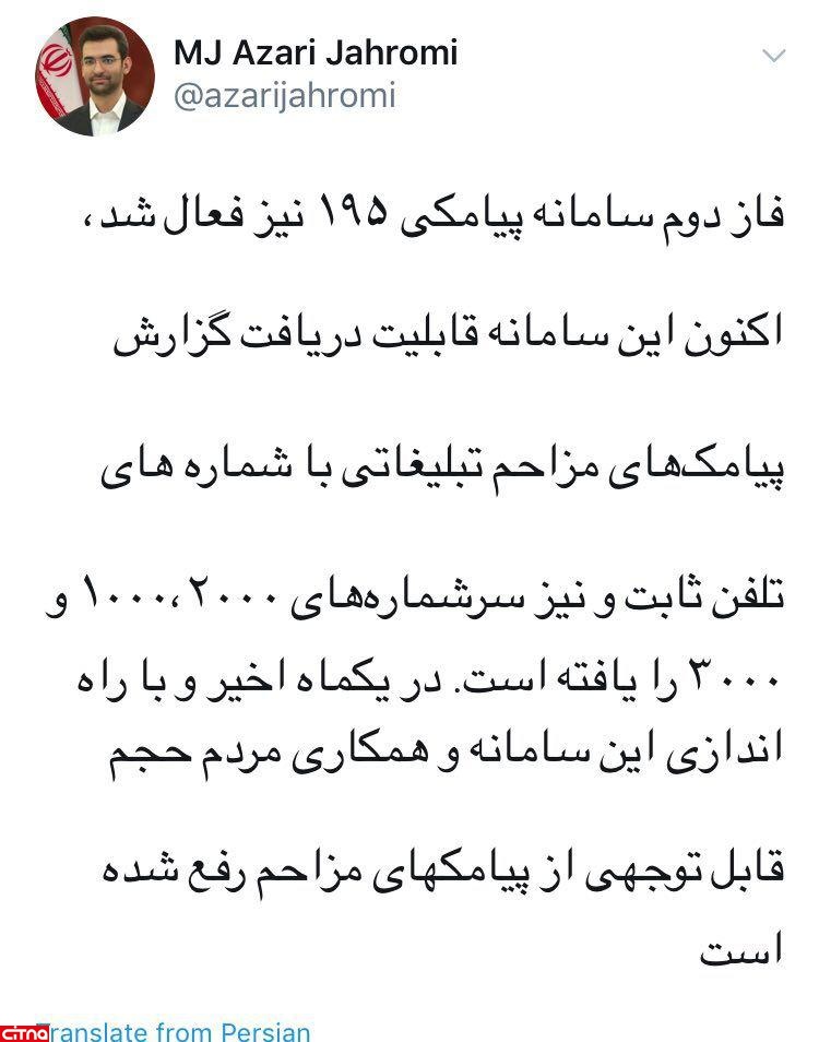 فاز دوم سامانه پیامکی ۱۹۵ نیز فعال شد، اکنون این سامانه قابلیت دریافت گزارش پیامکهای مزاحم تبلیغاتی با شماره های تلفن ثابت و نیز سرشمارههای ۱۰۰۰،۲۰۰۰ و ۳۰۰۰ را یافته است. در یک ماه اخیر و با راه اندازی این سامانه و همکاری مردم حجم قابل توجهی از پیامکهای مزاحم رفع شده است.