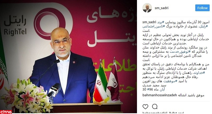 به گزارش سیتنا، مهندس سید مجید صدری، مدیرعامل رایتل در اینستاگرامش نوشت: