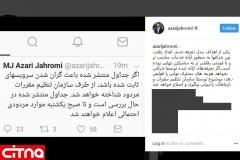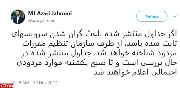 به گزارش سیتنا، مهندس آذری جهرمی در خصوص جداول تعرفههای اینترنت منصفانه که اخیرا توسط برخی شرکت های ارائه دهندهی سرویس اینترنت پرسرعت منتشر شده است، توئیت کرد: "اگر جداول منتشر شده باعث گران شدن سرویسهای ثابت شده باشد، از طرف سازمان تنظیم مقررات مردود شناخته خواهد شد. جداول منتشر شده در حال بررسی است و تا صبح یکشنبه موارد مردودی احتمالی اعلام خواهند شد".