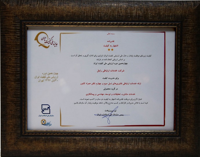 گفتنی است؛ این لوح برای مدیریت کیفیت ارایه خدمات ارتباطی فنآوریهای نسل سوم و چهارم تلفن همراه کشور در گروه محصولی خدمات مشاوره، تحقیقات و توسعه، مهندسی و پیمانکاری به شرکت خدمات ارتباطی رایتل اهدا شده است.
