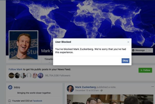 البته کاربران فیس بوک می توانند حساب های کاربری مختلف را برای مدتی مسدود کنند اما در ماه سپتامبر مشخص شد که مارک زاکربرگ از این قاعده مستثنی است و کاربران نمی توانند آپدیت ها و ویدئوهای زنده او را نادیده بگیرند. بنابراین کاربران هنگام بلاک کردن زاکربرگ با این پیام روبرو می شدند: «این پروفایل هم اکنون غیر قابل مسدود شدن است.»