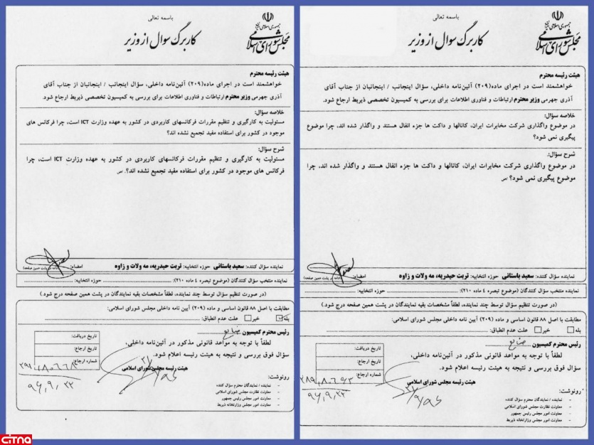 متن سوالات دکتر باستانی از وزیر ارتباطات و فناوری اطلاعات