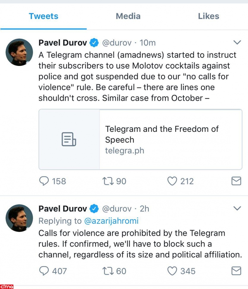 مدیر تلگرام از مسدود شدن کانال تلگرامی آمدنیوز به دلیل دعوت مردم به خشونت پراکنی مسدود شد.