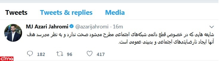 "شایعه هایی که در خصوص قطع دائمی شبکههای اجتماعی مطرح میشود صحت ندارد و به نظر میرسد هدف آنها ایجاد نارضایتیهای اجتماعی و بدبینی عمومی است".