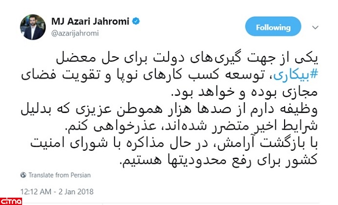 به گزارش سیتنا، مهندس آذری جهرمی دقایقی پیش توئیت کرد: