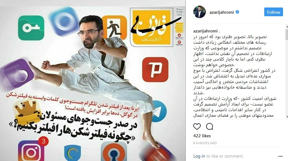 به گزارش سیتنا، مهندس آذری جهرمی، وزیر ارتباطات و فناوری اطلاعات با انتشار تصویری نوشت: این تصویر، تصویر طنزی بود که امروز در رسانه های مختلف انعکاس زیادی داشت.