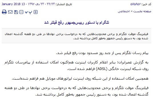 فیلترینگ موقت تلگرام و برخی محدودیتهایی که به درخواست برخی نهادها در طی دو هفته گذشته اعمال شده بود، به دستور رئیس جمهور بهطور کامل برداشته شد.