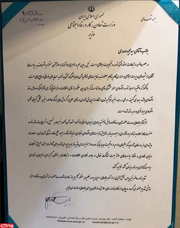 به گزارش سیتنا، مهندس سیدمجید صدری، مدیرعامل سابق رایتل که به تازگی عهده دار مسوولیت مدیرعاملی شرکت مخابرات ایران شده است، با انتشار عکس تقدیرنامهی وزیر تعاون، کار و رفاه اجتماعی از وی، در اینستاگرامش نوشت: