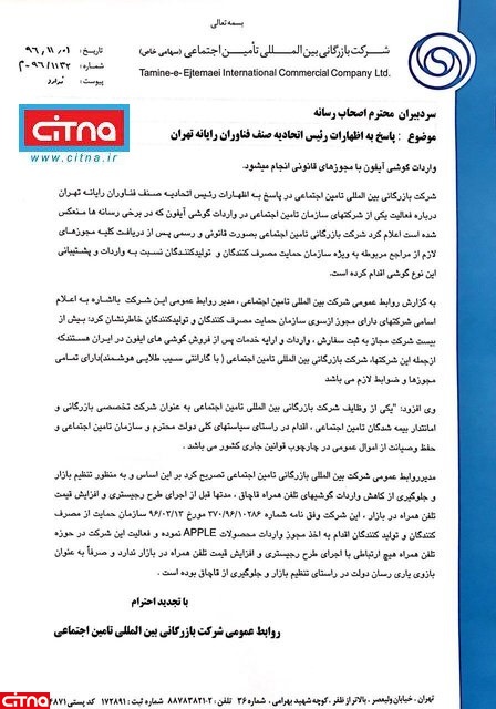 مدیر روابط عمومی شرکت بینالمللی بازرگانی تامین اجتماعی در واکنش به اخبار منتشره پیرامون واردات گوشی آیفون از سوی سازمان تامین اجتماعی گفت: در راستای تنظیم بازار و جلوگیری از کاهش واردات گوشیهای تلفن همراه قاچاق، مدتها قبل از اجرای طرح رجیستری و افزایش قیمت تلفن همراه در بازار، این شرکت در خردادماه جاری اقدام به اخذ مجوز واردات محصولات APPLE کرده و فعالیت این شرکت در حوزه تلفن همراه هیچ ارتباطی با اجرای طرح رجیستری و افزایش قیمت تلفن همراه در بازار ندارد.