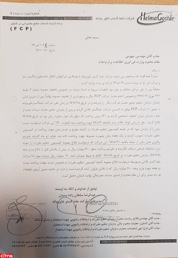 با ضبط ضمانتنامه ۱۹ میلیارد تومانی شرکت حلما گستر تلاش (کنسرسیوم متشکل از ۱۱ شرکت FCP) توسط سازمان تنظیم مقررات و ارتباطات رادیویی، مدیران این شرکتها با ارسال نامهای خطاب به وزیر فناوری اطلاعات و ارتباطات خواستار مداخله وی برای حل این مشکل شدند.