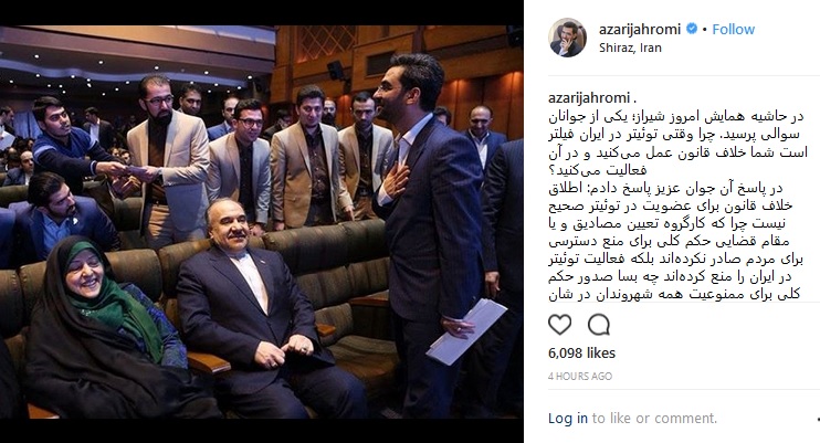 در حاشیه همایش امروز شیراز؛ یکی از جوانان سوالی پرسید. چرا وقتی توئیتر در ایران فیلتر است شما خلاف قانون عمل میکنید و در آن فعالیت میکنید؟