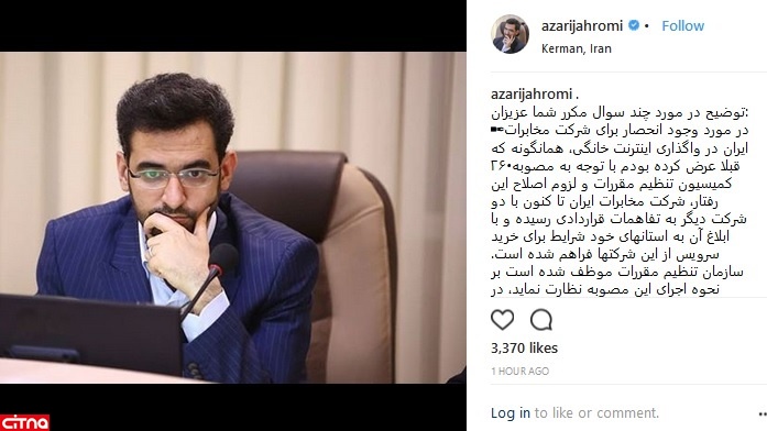 *در مورد وجود انحصار برای شرکت مخابرات ایران در واگذاری اینترنت خانگی، همانگونه که قبلا عرض کرده بودم با توجه به مصوبه 260 کمیسیون تنظیم مقررات و لزوم اصلاح این رفتار، شرکت مخابرات ایران تا کنون با دو شرکت دیگر به تفاهمات قراردادی رسیده و با ابلاغ آن به استانهای خود شرایط برای خرید سرویس از این شرکتها فراهم شده است. سازمان تنظیم مقررات موظف شده است بر نحوه اجرای این مصوبه نظارت نماید، در صورت وجود مشکل گزارش آن به سامانه ۱۹۵ در پیگیری موثر خواهد بود.
