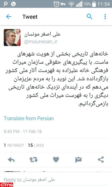 به گزارش ایسنا، با اعلام رای قطعی باقی ماندن "خانه علیزاده" در فهرست آثار ملی، معاون رئیسجمهور این خبر را در صفحه شخصی توئیتر خود منتشر کرد.