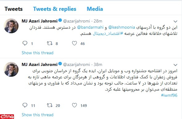 "امروز در افتتاحیه جشنواره وب و موبایل ایران، ایده یک گروه از خراسان جنوبی برای فروش زعفران با کمک فناوری اطلاعات و گروهی از هرمزگان برای عرضه ماهی تازه به تعدادی از شهرها در ۷ ساعت، جالب توجه بود و نشان میداد که با فناوری و مزیتهای منطقهای میتوان بر محرومیتها غلبه کرد.