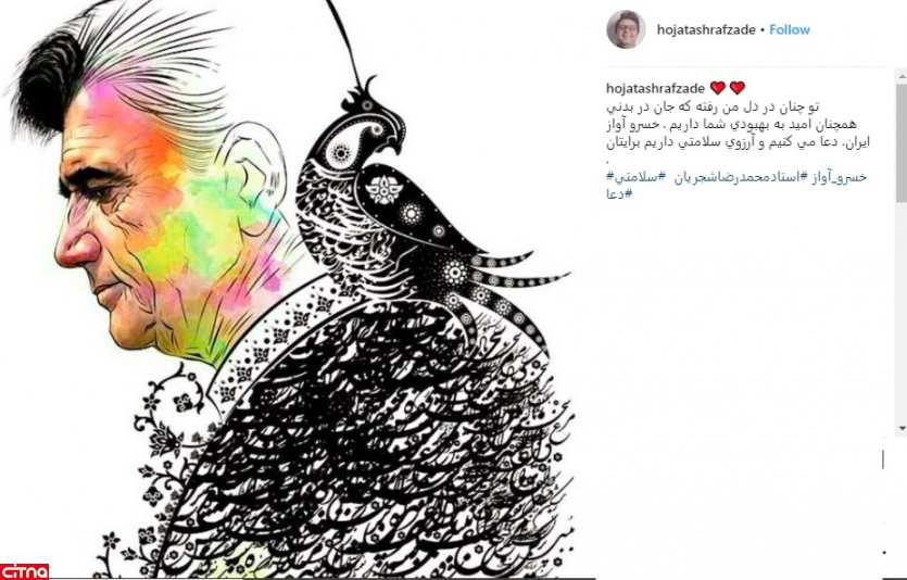به گزارش سیتنا، حجت اشرف زاده با انتشار عکسی از محمدرضا شجریان در اینستاگرام نوشت: «تو چنان در دل من رفته که جان در بدنی. همچنان امید به بهبودی شما داریم. خسرو آواز ایران. دعا می کنیم و آرزوی سلامتی داریم برایتان.»
