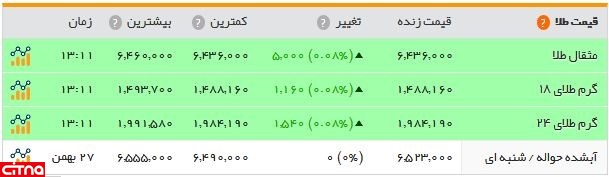 اما در بازار طلا، قیت هر گرم طلای 18عیار با افزایش 116 تومانی مواجه شد. در حال حاضر در بازار هر گرم طلای 18عیار 148 هزار و 816 تومان و هر مثقال طلا 643 هزار و 600 تومان است.