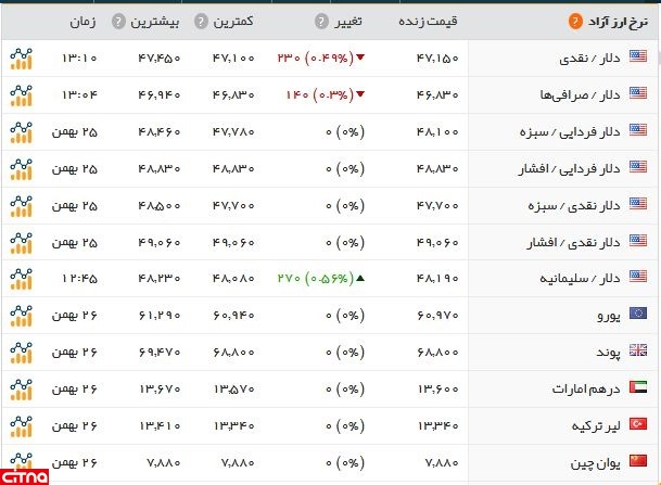 در بازار ارز قیمت دلار نقدی 23 تومان و دلار صرافی 14 تومان کاهش یافت. هماکنون قیمت دلار نقدی 4 هزار و 615 تومان و دلار صرافی 4 هزار و 683 تومان است. یورو نیز با قیمت 6 هزار و 97 تومان، پوند 6 هزار و 880 تومان، درهم امارات یکهزار و 360 تومان، لیر ترکیه یکهزار و 334 تومان و یوان چین 788 تومان به فروش میرود.