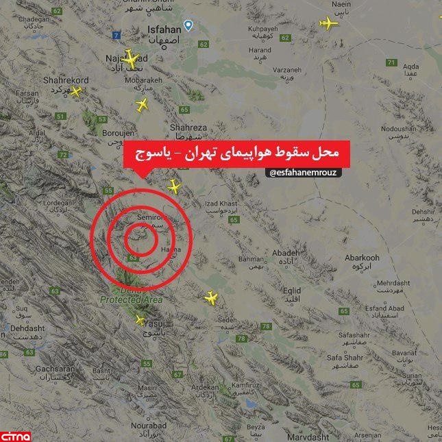 به گزارش سیتنا، فرماندار بویراحمد اعلام کرد هواپیمای مسافربری تهران-یاسوج در کوه های پادنا سقوط کرد. تصویر زیر محل سقوط هواپیما را نشان میدهد: