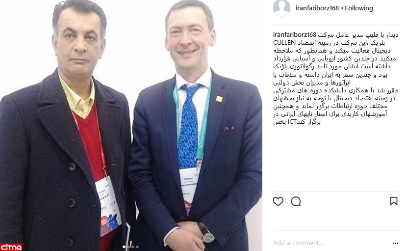 به گزارش سیتنا، مهندس "فریبرز ایرانی" در پستی پیرامون دیدار با فلیپ مدیرعامل شرکت CULLEN بلژیک، نوشت: این شرکت در زمینه اقتصاد دیجیتال فعالیت می کند و همانطور که ملاحظه می کنید در چندین کشور اروپایی و آسیایی قرارداد داشته است. ایشان مورد تایید رگولاتوری بلژیک است و چندین سفر به ایران داشته و ملاقات هم با اپراتورها و مدیران بخش دولتی داشته است.