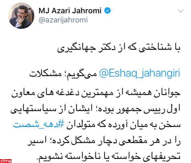 به گزارش سرویس وبگردی سیتنا، به دنبال اظهارات معاون اول رئیس جمهور پیرامون مشکلات دهه شصتی ها، مهندس آذری جهرمی، توئیت کرد: