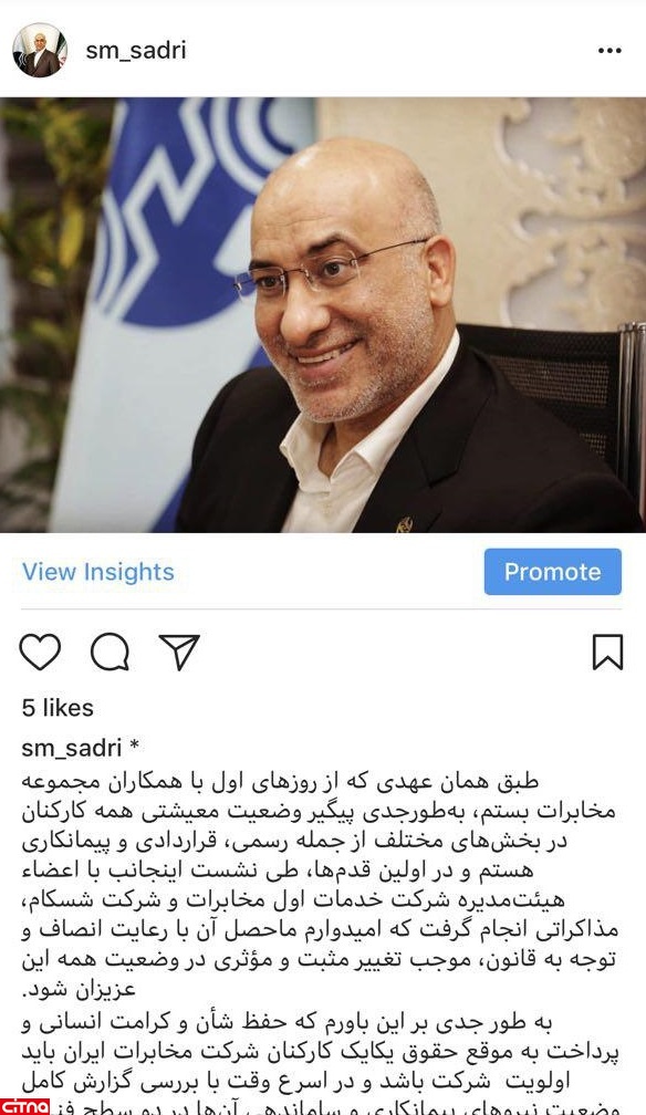 طبق همان عهدی که از روزهای اول با همکاران مجموعه مخابرات بستم، به طور جدی پیگیر وضعیت معیشتی همه کارکنان در بخشهای مختلف از جمله رسمی، قراردادی و پیمانکاری هستم و در اولین قدمها، طی نشست اینجانب با اعضاء هیئتمدیره شرکت خدمات اول مخابرات و شرکت شسکام، مذاکراتی انجام گرفت که امیدوارم ماحصل آن با رعایت انصاف و توجه به قانون، موجب تغییر مثبت و مؤثری در وضعیت همه این عزیزان شود.