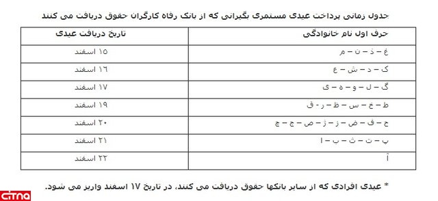 مستمری بگیرانی که نام خانوادگی شان با حروف ک، د، ش، ع آغاز می شود نیز در ١۶ اسفند عیدی را دریافت می کنند.