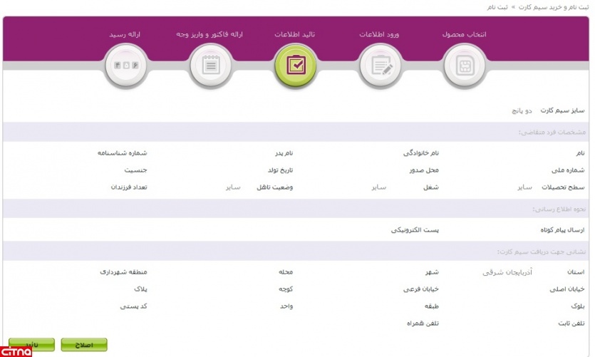 در این مرحله، تمامی اطلاعات ورودی شما جهت تایید نمایش داده میشوند. در صورت نیاز به اصلاح احتمالی میتوانید با انتخاب گزینه "اصلاح" به صفحه قبل بازگردید. در غیر اینصورت، بر روی دکمه تاییدکلیک نمایید.