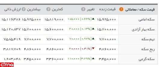 نیم سکه با هفت هزار تومان افزایش 770 هزار تومان شد و ربع سکه با دو هزار تومان کاهش 486 هزار تومان قیمت خورد. سکه گرمی امروز 11 هزار تومان افزایش یافت و 345 هزار تومان شد.