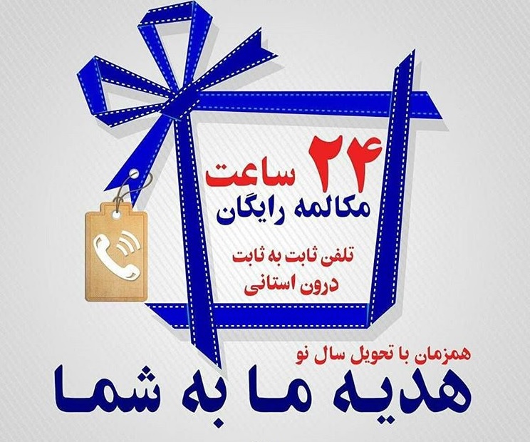 عیدی امسال را مکالمه رایگان ۲۴ ساعته درون استانی برای مکالمات ثابت به ثابت در نظر گرفتیم تا قدمی در راستای مسولیت اجتماعی در بعد مشتریان صورت بگیرد.
