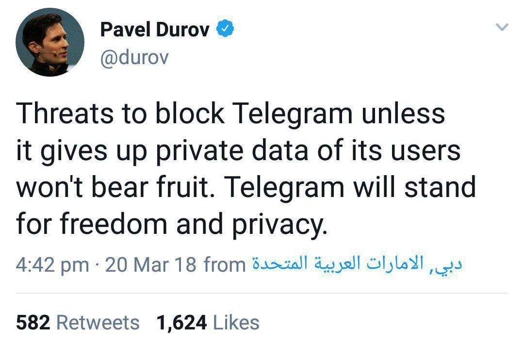 مدیر تلگرام بعد از رد شکایتش در دادگاه عالی روسیه، توئیت کرد: تهدیدها برای مسدود کردن تلگرام در ازای ارایه اطلاعات خصوصی کاربران جواب نمی دهد.