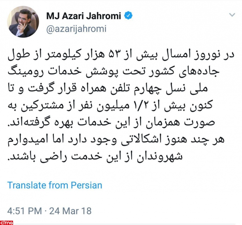 در نوروز امسال بیش از ۵۳ هزار کیلومتر از طول جادههای کشور تحت پوشش خدمات رومینگ ملی نسل چهارم تلفن همراه قرار گرفت و تا کنون بیش از ۱/۲ میلیون نفر از مشترکین به صورت همزمان از این خدمات بهره گرفتهاند. هر چند هنوز اشکالاتی وجود دارد اما امیدوارم شهروندان از این خدمت راضی باشند.