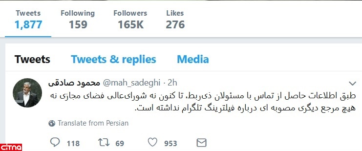 به گزارش سیتنا، محمود صادقی، نماینده مردم تهران در مجلس شورای اسلامی امروز در پست توییت خود خبر داد: طبق اطلاعات حاصل از تماس با مسوولان ذیربط، تاکنون، نه شورای عالی فضای مجازی نه هیچ مرجع دیگری، مصوبه ای درباره فیلترینگ تلگرام نداشته است.