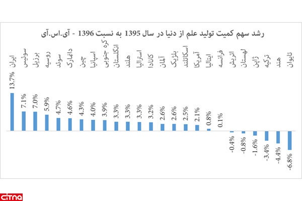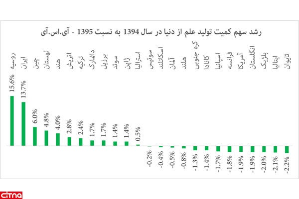 به این ترتیب رشد سهم ایران از کمیت علم دنیا در هر سال ۱۳.۷ درصد بوده است. به این ترتیب در سال ۱۳۹۵ به نسبت ۱۳۹۴ از لحاظ رشد سهمی کشور روسیه با یک رشد ۱۵.۶ درصد برتر از ایران قرار گرفت. بعد از ایران چین، لهستان، هند، اتریش، ترکیه، دانمارک، برزیل، سوئد، ژاپن و استرالیا همگی از یک رشد مثبت در این همین دوره برخوردار بودند.