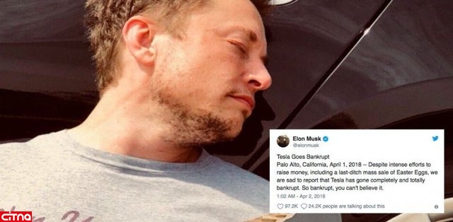 ایلان ماسک مدیرعامل خودروسازی تسلا در حساب کاربری توییتر خود اعلام کرد که شرکت خودروسازی کاملا ورشکست شده است که البته خیلی زود معلوم شد که دروغ سیزده بوده است.