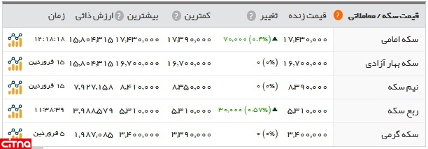 ربعسکه اما 3 هزار تومان بالا رفت و با قیمت 531 هزار تومان به فروش رفت. این در حالی است که سکه یکگرمی 340 هزار تومان قیمت داشت. همچنین هر گرم طلای 18عیار با قیمت 160 هزار و 59 تومان فروخته شد.